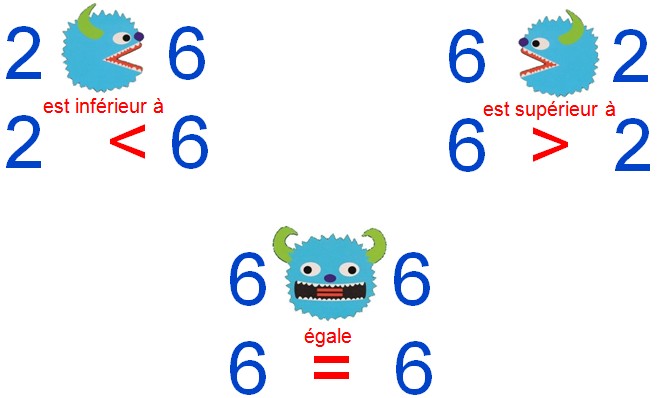En mathématiques le mot inférieur comprend parfois légalité mais ce nest pas le cas du langage courant et de linformatique. 6 9 signifie que 6 est inférieur à 9. Pour repérer et se souvenir du sens de pour supérieur et pour inférieur regardez sil est possible de dessiner un s pour supérieur en rajoutant une barre en haut du signe.