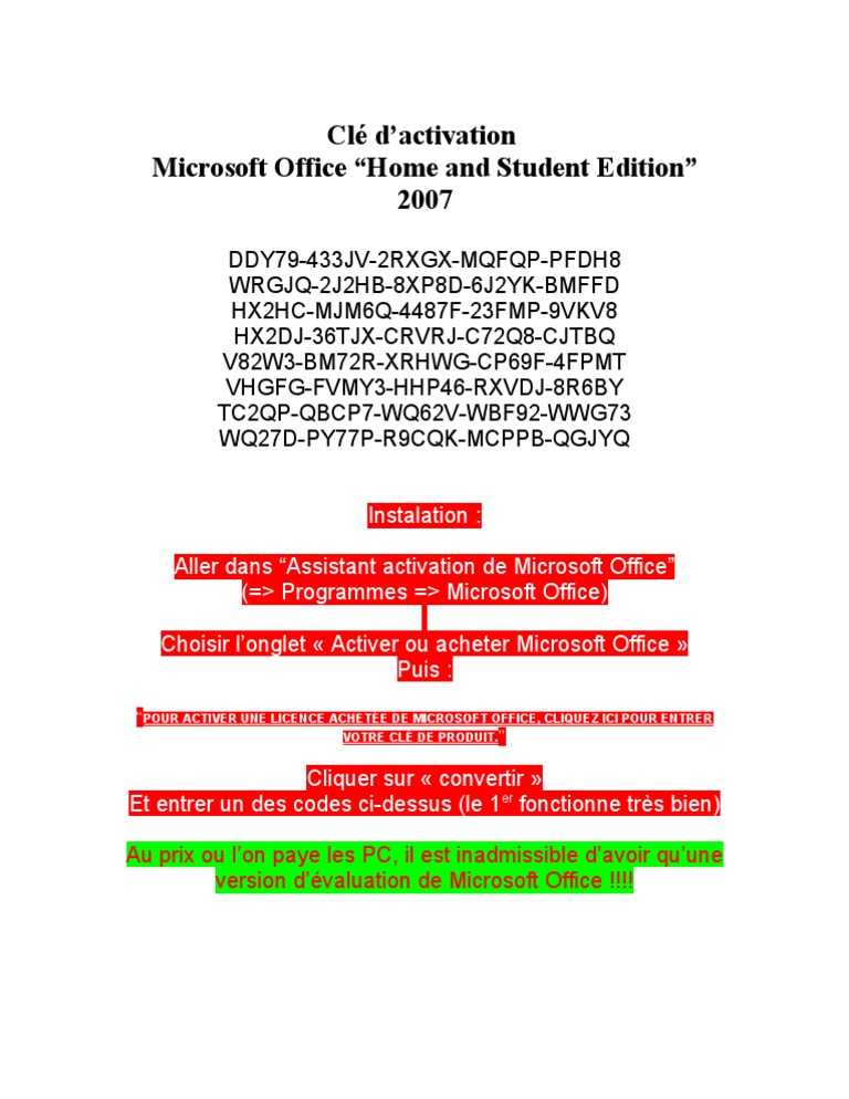 POUR ACTIVER UNE LICENCE ACHETÉE DE MICROSOFT OFFICE CLIQUEZ ICI POUR ENTRER VOTRE CLÉ DE PRODUIT Cliquer sur convertir Et entrer un des codes ci-dessus le 1er fonctionne très bien. 10 years ago 92K views. Activate my Office 2007 programs Activate Office 2007 over the Internet or by phone.